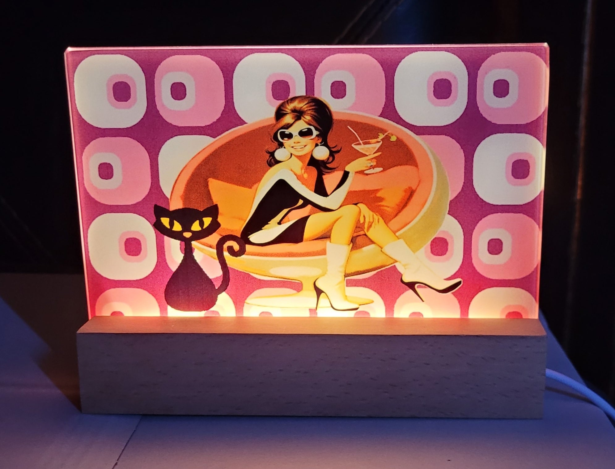 Glass measures 6"x4". Comes with a wood base that has an on/off button, led light strip, and 37" cord. Fits standard usb wall charger (not included)