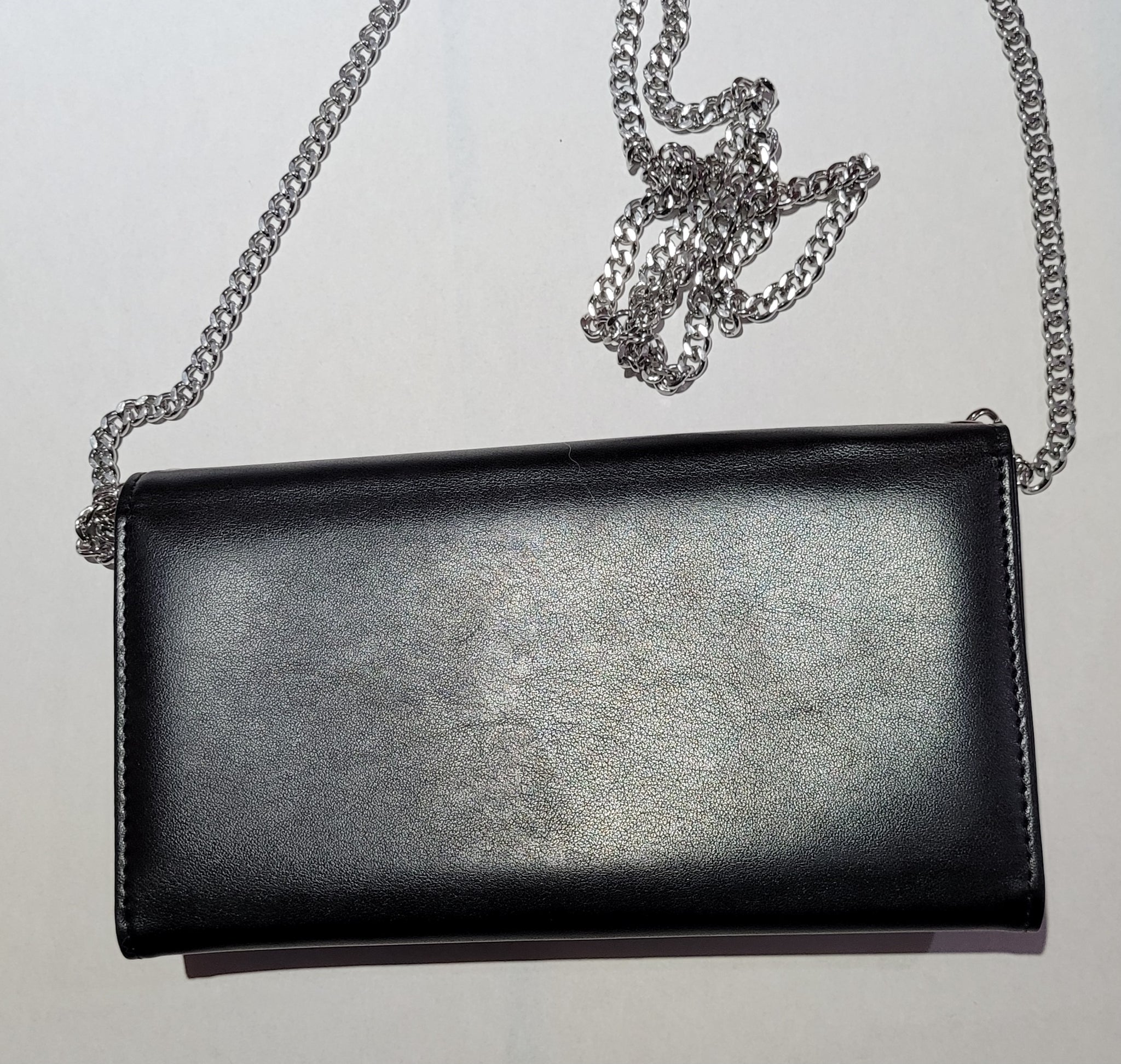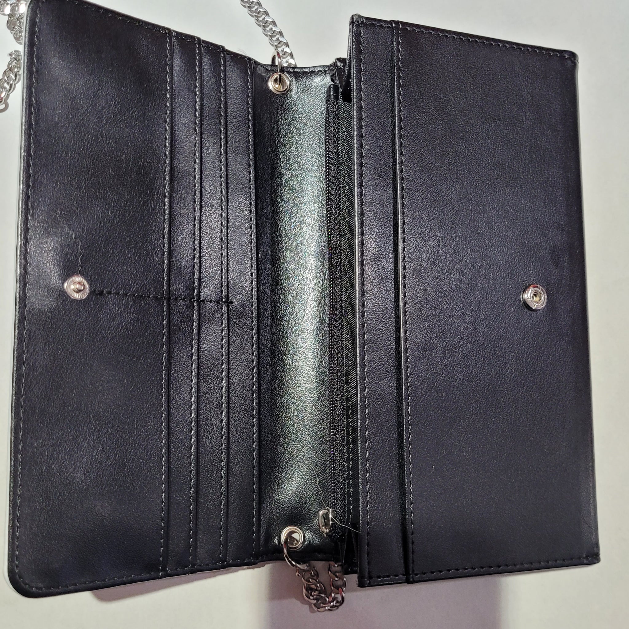 Comes with a wrist strap and a 49" crossbody chain. Measures 8" wide by 4.5" tall. Inside has a 6.5" zippered pouch, 4 compartment slots, and 6 card slots. Snap closure. Printed on 1 side